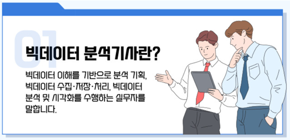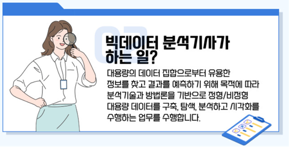 빅데이터 분석기사는 대용량의 데이터 집합으로부터 유용한 정보를 찾고 결과를 예측하기 위해 목적에 따라 분석기술과 방법론을 기반으로 정형/비정형 대용량 데이터를 구축, 탐색, 분석하고 시각화를 수행하는 업무를 수행한다.