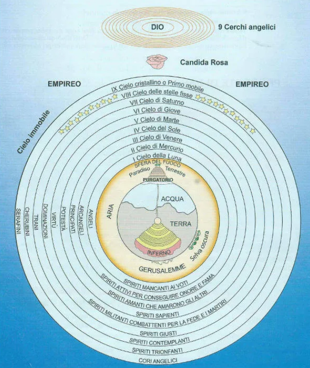여기서부터는 단테의 평생의 연인 베아트리체가 안내를 도와주며 제 10천인 지고천은 성 베르나르도가 안내를 한다. 작중에서 지난 시간은 지옥과 연옥은 각각 3일이지만 천국만은 1일이다. 천국은 옛 유럽인들의 믿음에 따라 지구를 둘러싸고 있는 여러 겹의 하늘로 이루어진 것으로 묘사되며, 각각의 죄에 따라 벌을 받는 지옥과 연옥처럼 각각의 선에 따라 행복을 누리고 있다. 사실 모든 영혼은 지고천에 살지만, 축복의 여러 계층을 단테에게 알려주고자 특별히 맞춤형 배치된 것이라고 한다. 그러나 영혼들이 받는 축복은 모두 똑같다.