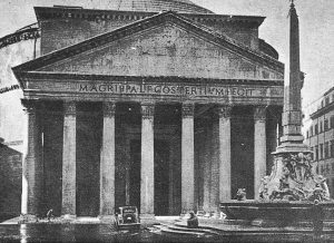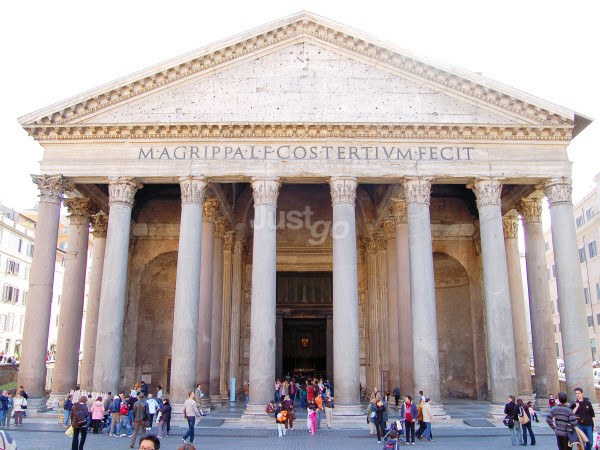 판테온은 로마인이 신봉하던 다신교(多神敎)의 신전으로 축조되었으며 주 건축 자재는 벽돌과 로마의 콘크리트이다. 로마 시내의 가장 오래된 길 가운데 하나인 비아 코르소(Via Corso : 옛 마차 경주로)의 서쪽에서 멀지 않은 지점에 위치한 이 신전은 기원전 27년에 시작되었다고 하나 처음의 건물은 현재와 달랐다고 한다.