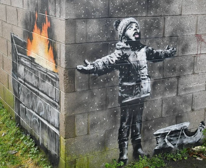 아이가 떨어지는 눈송이를 맛보고 있는 것처럼 보이지만 눈이 날아오르는 곳을 따라 벽 모서리를 돌아보면 연기를 내뿜고 있는 불길이 있다. 뱅크시가 이곳에 그림을 그린 이유는 개리 오웬이라는 한 남성의 요청에 의해서다.