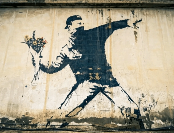 전통적인 폭동 복장을 하고 화염병 대신 꽃을 어디론가 던지려는 자세를 취하고 있다. 이 그림은 뱅크시의 작품중에서도 유명한 작품 중 하나로 폭력과 테러에 대한 반대와 평화를 향한 기도의 메세지를 담고 있습니다. 스프레이 페인트로 스텐실 작업을 한 것으로 이스라엘 예루살렘의 한 차고 벽에 그려졌다.