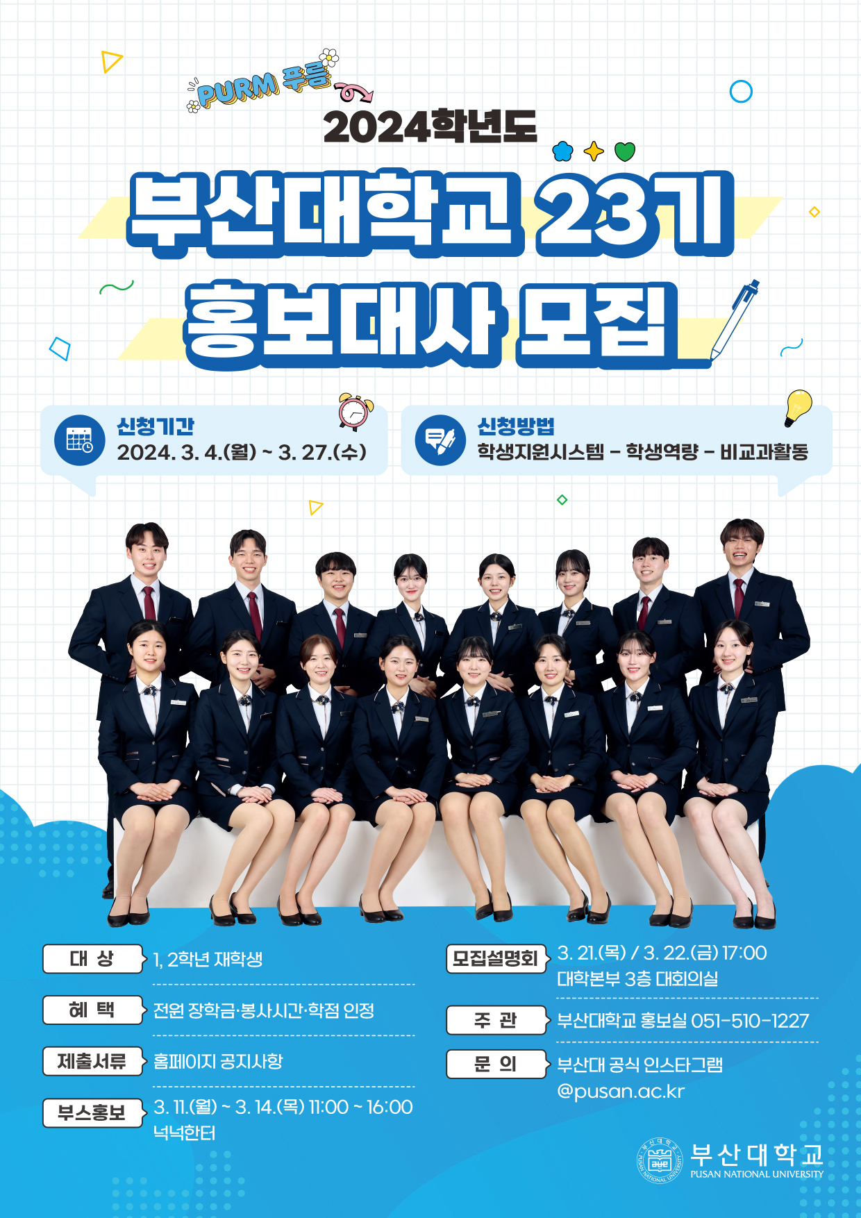 그리고 1.2학년 재학생만이 참여할 수 있는 학교 홍보대사 프로그램이 있다. 이는 학교 홍보대사 ‘푸름’또는 학과 홍보대사 ‘피움’으로 두가지 홍보대사들로 운영된다. 학기 초에 지원서와 면접으로 선발되며 활동기간은 1년반이다. 방학기간에도 활동을 꾸준히 할 수 있다는 장점도 있으며 부산대학교 진학을 희망하는 학생들에게 학교를 홍보함으로써 동기부여와 학교의 이미지를 제고하는 봉사활동이라 할 수 있으며 장학금처럼 학교에서 활동비가 지급되고 각 홍보대사에게 맞춤정장을 제공한다. 학교생활도 즐겁게 하면서 부산대학교를 대내외적으로 멋지게 홍보할 수 있는 봉사활동 프로그램이다.
