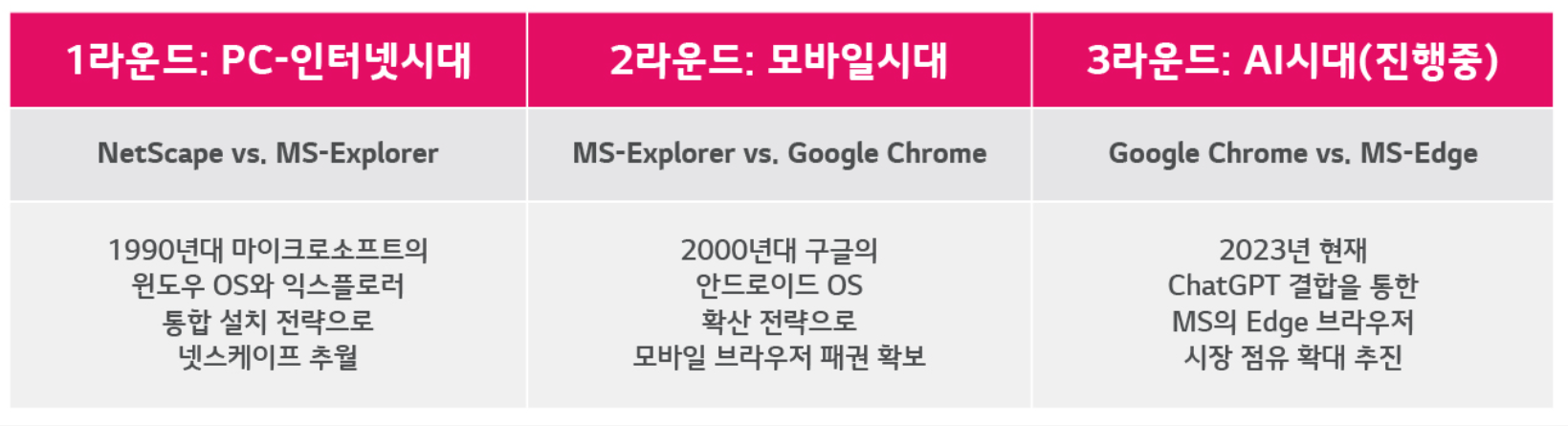 챗GPT로 대표되는 생성형 AI 모델이 불러온 변화엔 어떤 것들이 있을까? 우선 검색시장의 획기적 변화이다. 마이크로소프트는 챗GPT를 앞세워 지난 20년간 구글이 독점했던 검색 시장에 도전장을 내밀었는데, 챗GPT의 등장으로 검색 시장은 효율적인 검색에서 생성과 창의가 결합된 검색으로 패러다임이 전환되고 있다.