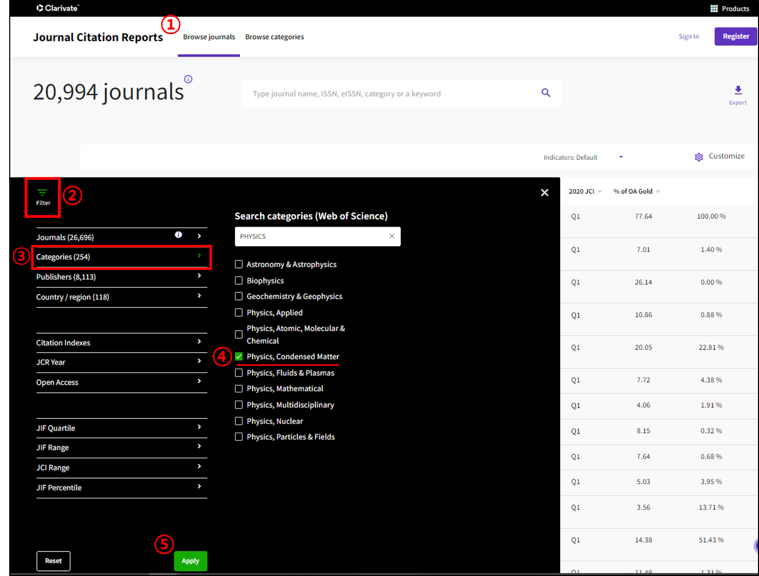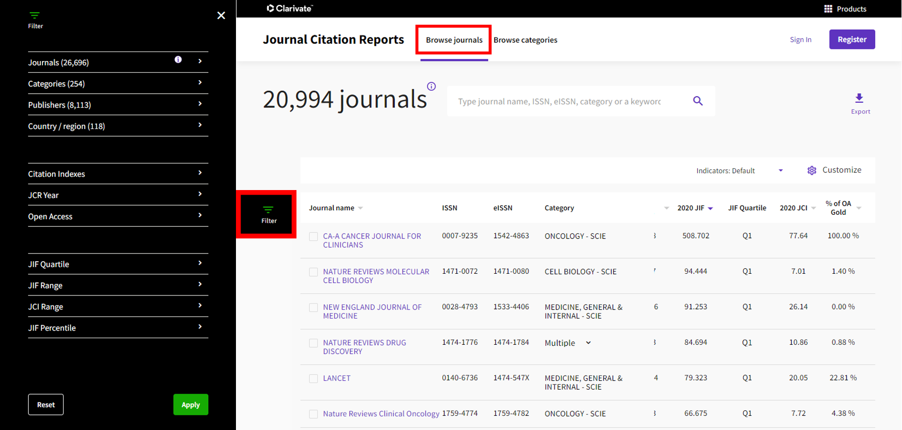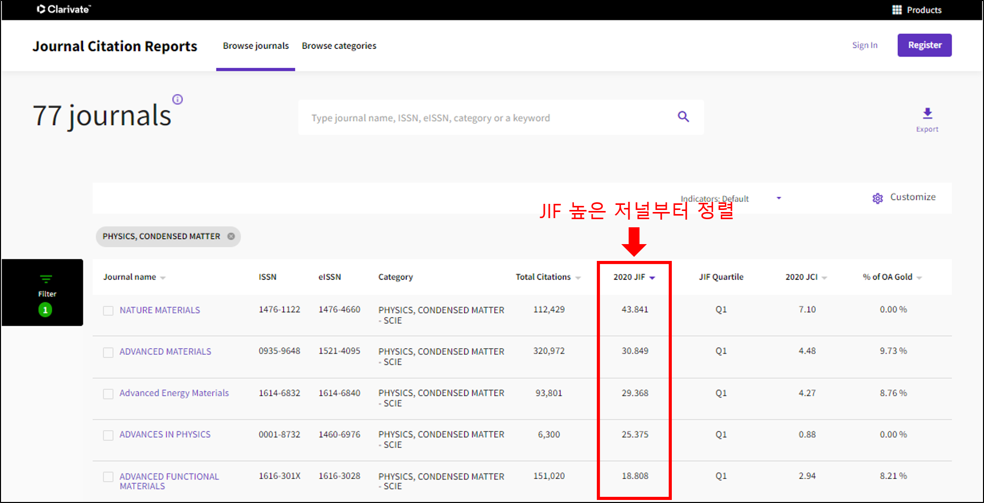 -필터를 적용하지 않았을 경우 JCR에 있는 모든 저널을 확인할 수 있고,