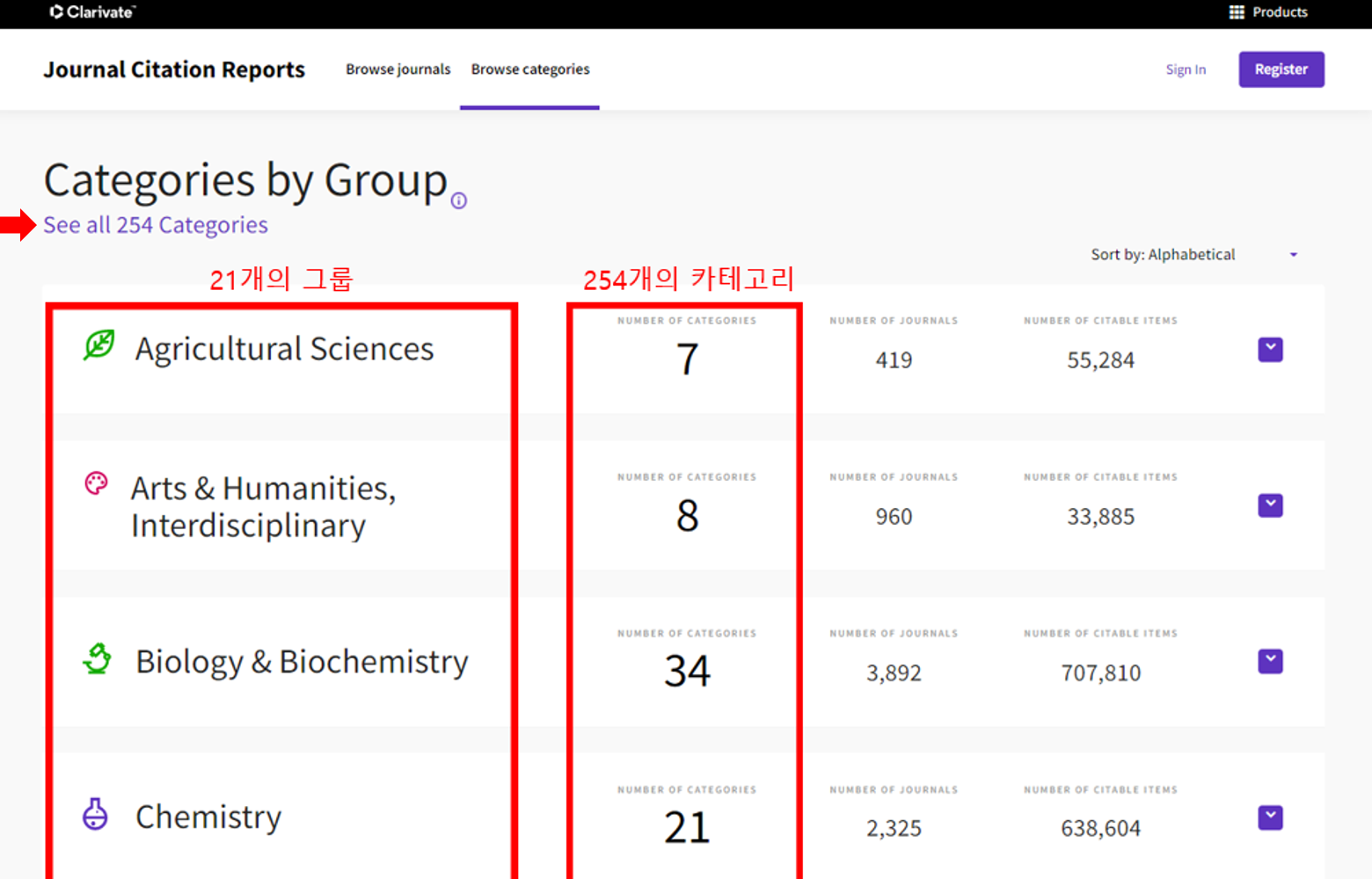 -관심 주제분야에 따라 그룹을 선택하면 Web of Science의 카테고리 정보에 맞추어 각 카테고리에 색인된 저널 목록을 확인할 수 있습니다.