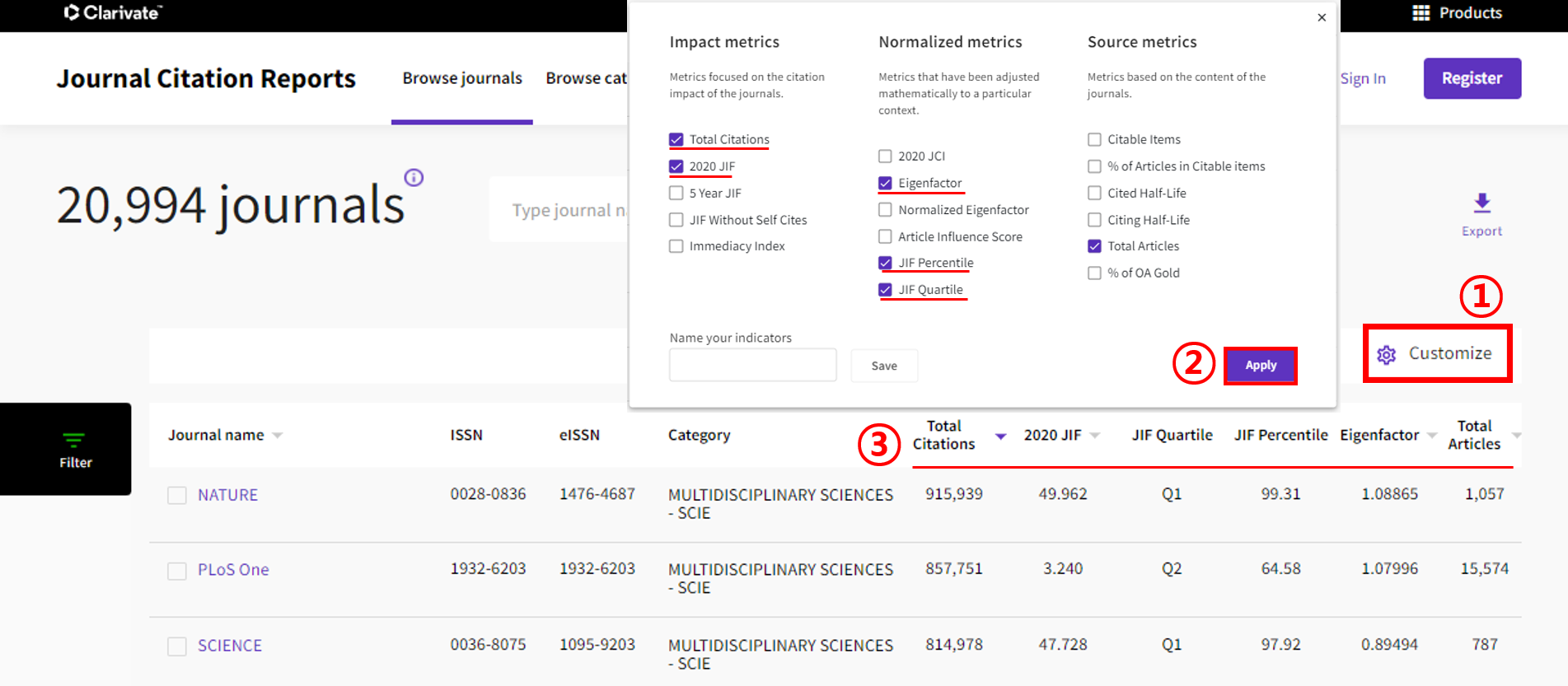 ① 내가 원하는 저널 평가 지수로 저널을 검색하고 싶을 경우, Customize를 클릭하여