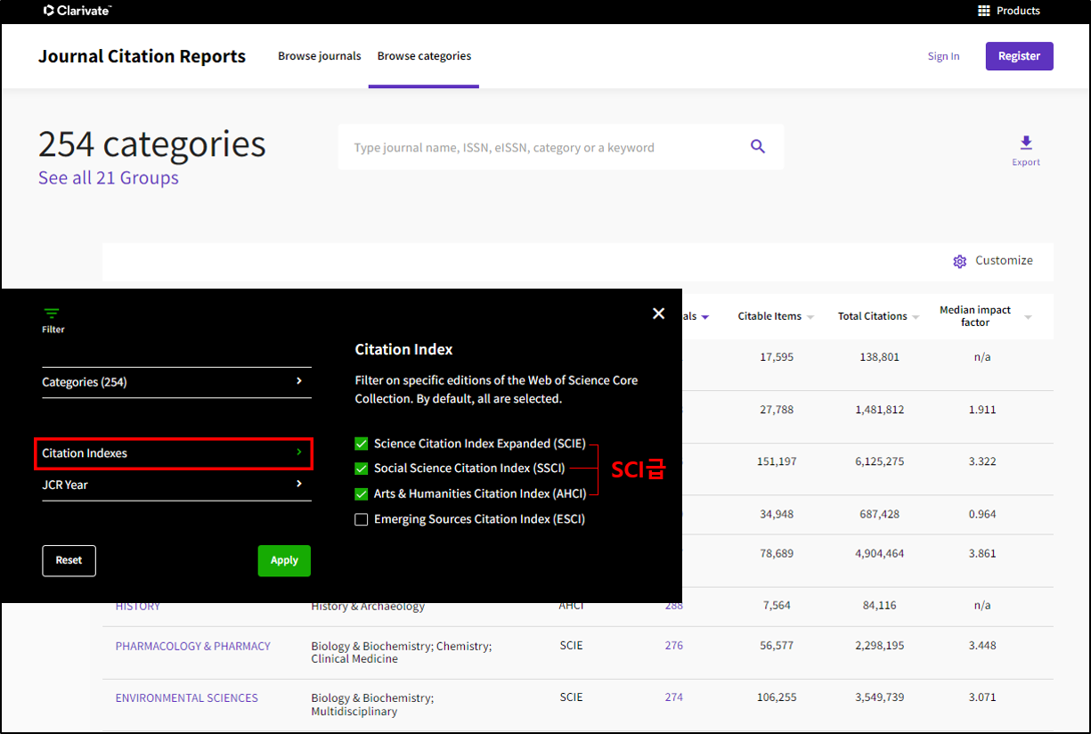 기본값으로 SCIE, SSCI, AHCI, *ESCI가 모두 선택되어 있습니다. (*ESCI는 SCI급이 아닌 SCI 후보 개념으로, SCI급 저널로 필터링할 경우 ESCI는 선택에서 제외)