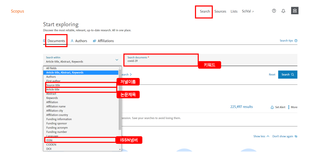 – 왼편에서 저널이름, 논문제목, ISSN 등 필드를 설정하여 검색할 수 있습니다.