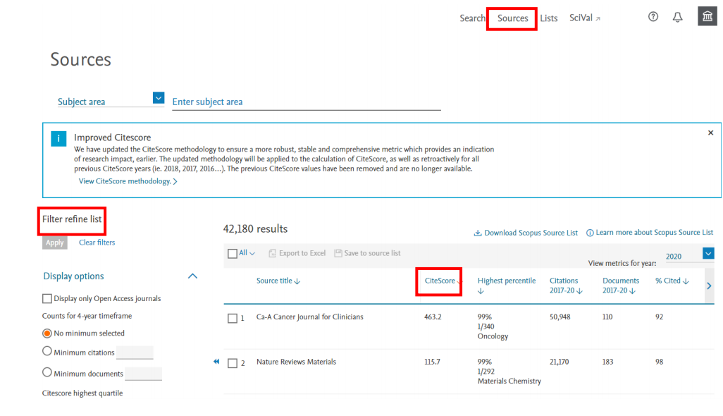 -기본적으로 CiteScore가 높은 순으로 정렬되어 있습니다.