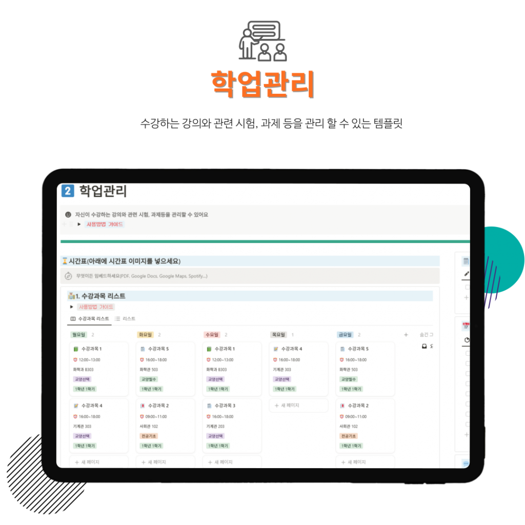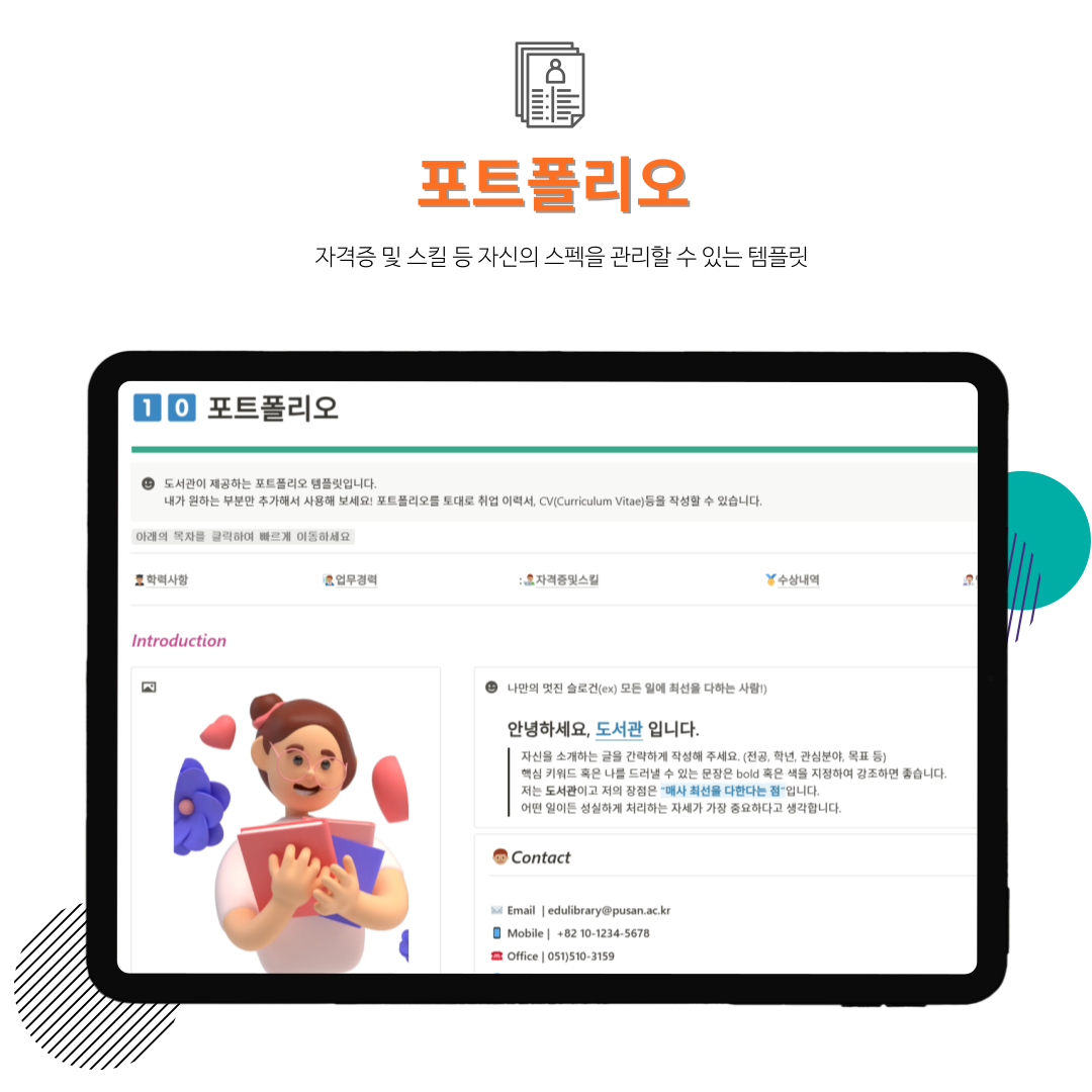 부산대학교 도서관에서는 학부생 및 대학원생의 학습 및 연구활동 지원을 하고 학생들이 유용한 자원에 쉽게 접근할 수 있는 기초 학습 환경 제공하기 위해 노션 템플릿 11종을 무료 배포합니다. 해당 템플릿들을 활용하여 학업관리 및 성과를 크게 향상시킬 수 있습니다.