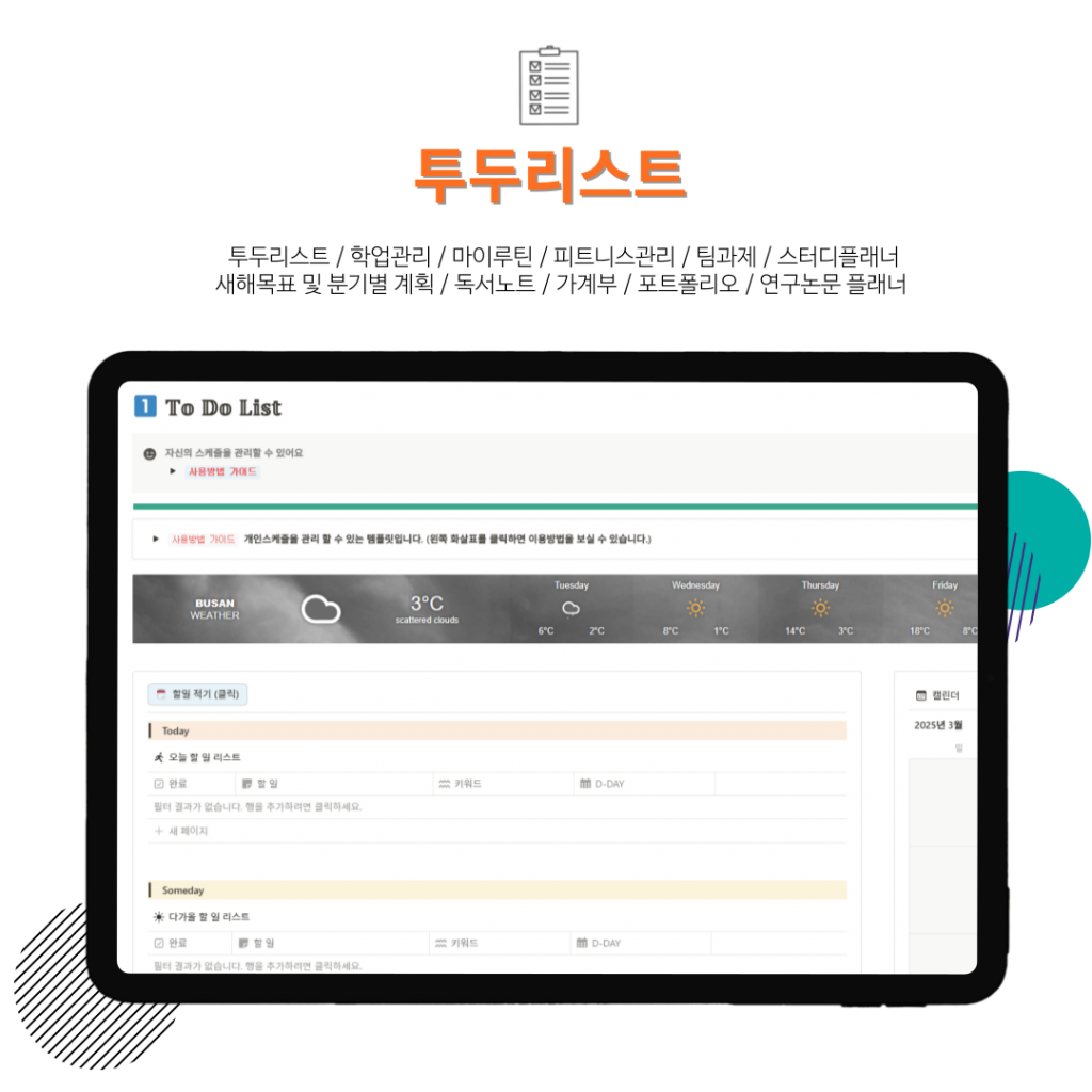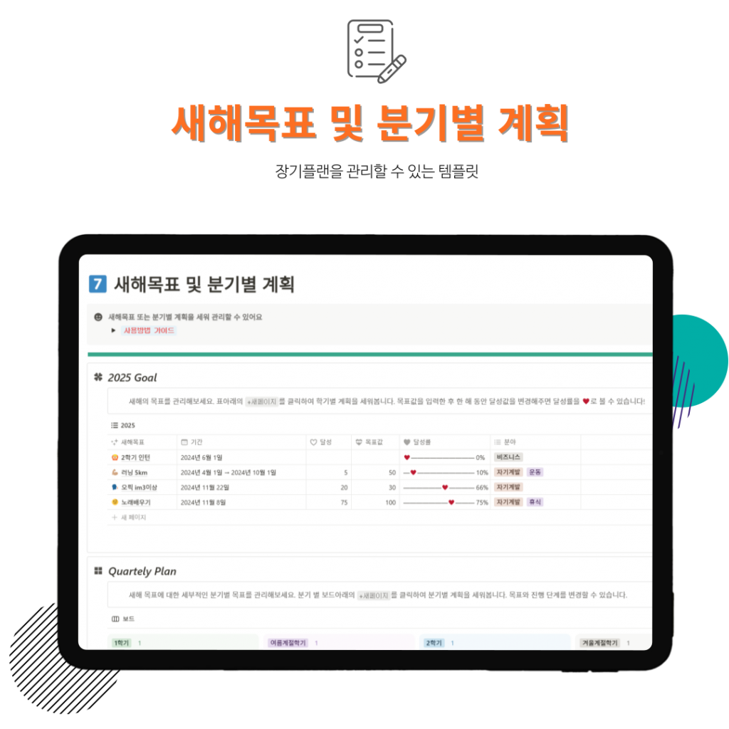 1. 종류: 투두리스트, 학업관리, 마이루틴, 피트니스관리, 팀과제, 스터디 플래너, 새해목표 및 분기별 계획, 독서노트, 가계부, 포트폴리오, 연구논문 플래너