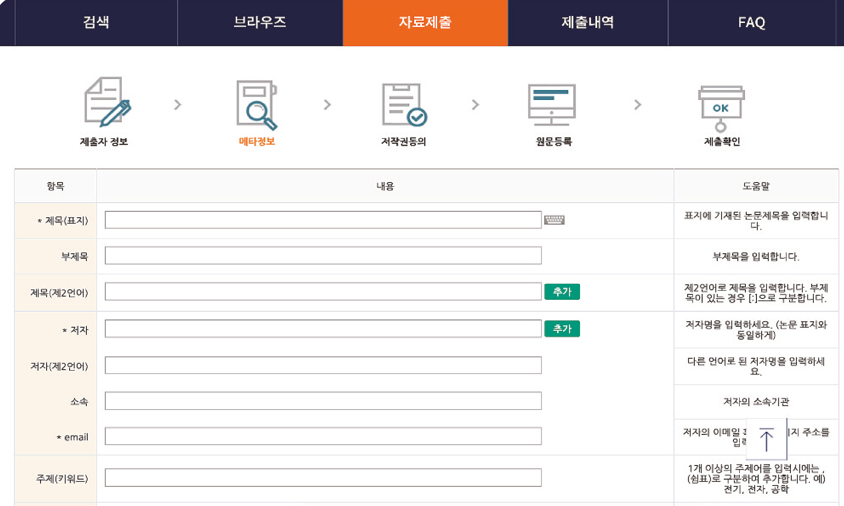 메타정보? 그게뭐야? 말이 어렵다고 놀라지 말자. 메타정보는 제출하고자하는 논문의 논문명, 초록, 키워드 등과 같은 논문에 대한 기본정보를 말한다.