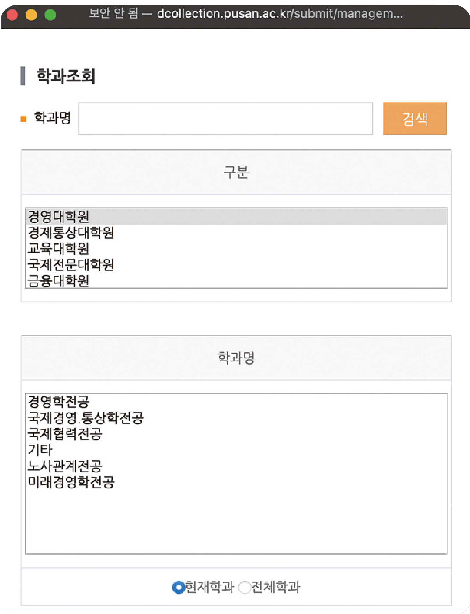 학과명이 달라진 경우 학과가 조회되지 않을 수 있다. 당황해서 비슷한 학과를 선택하지 말고 도서관(510-7600)에 연락하여 정확한 학과명을 추가하자.