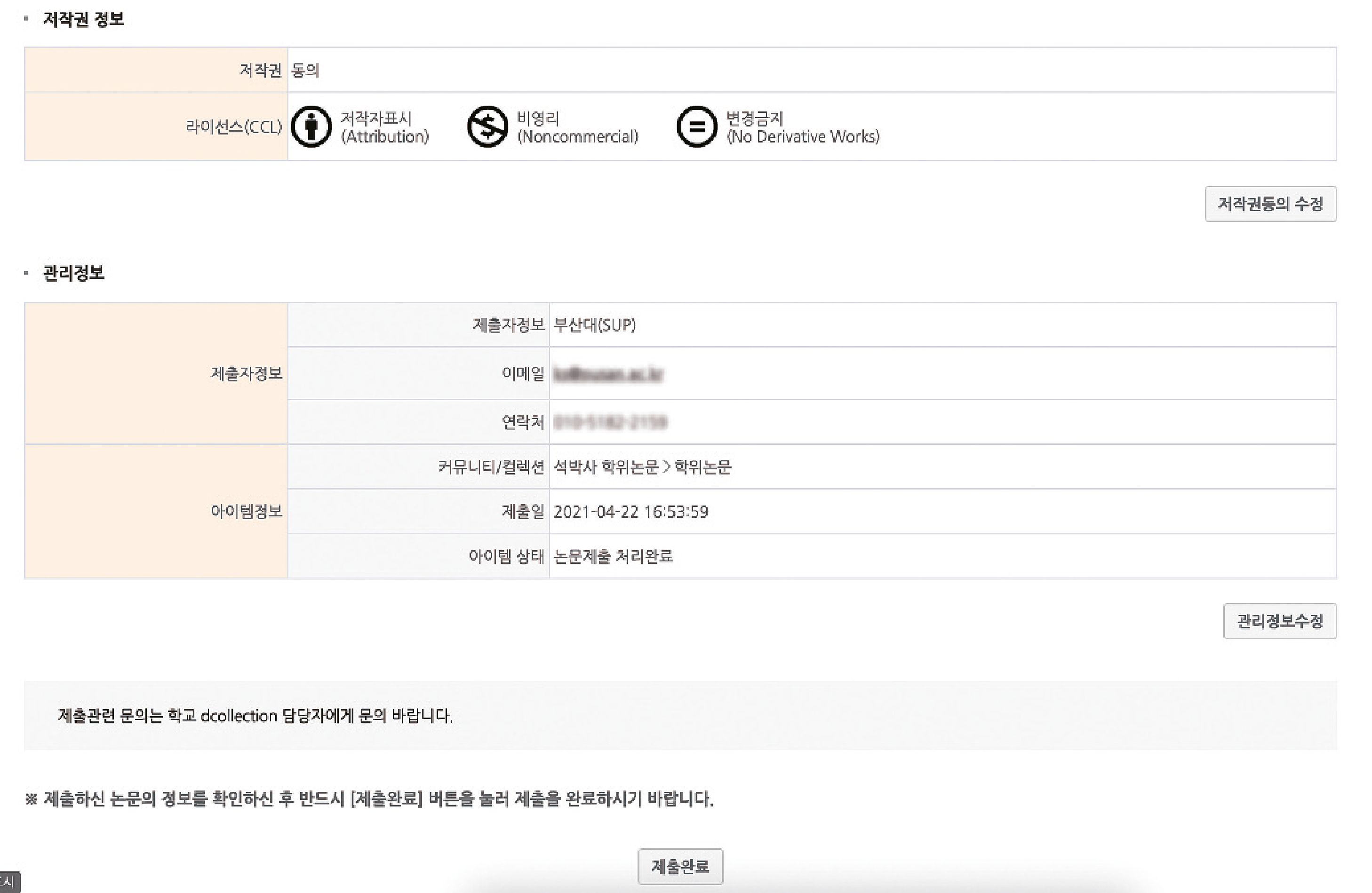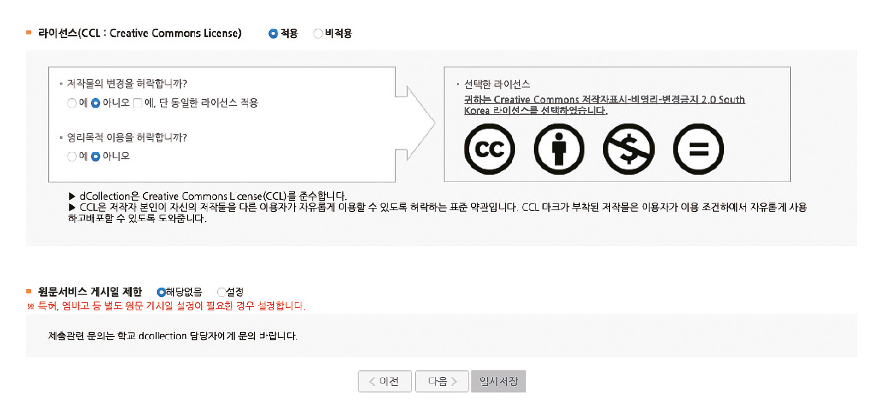 *라이센스 설정(CCL): 논문에 대한 허용범위를 설정하는 것으로 저작물 변경, 상업적이용가능 여부를 정한다. 기본값은 ‘변경불가’, ‘영리목적 이용불가’로 설정되어 있다.