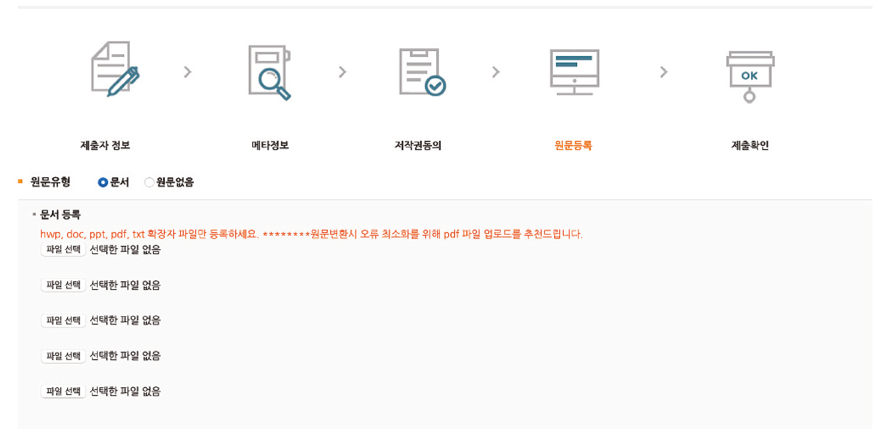 최종적으로 확인이 끝난 논문을 업로드 한다. 파일 형식과 관계없이 시스템에서 PDF로 변환된다. 이때 암호 등으로 보안이 걸려있을 경우 변환이 불가능하므로 파일의 보안을 해제한다.