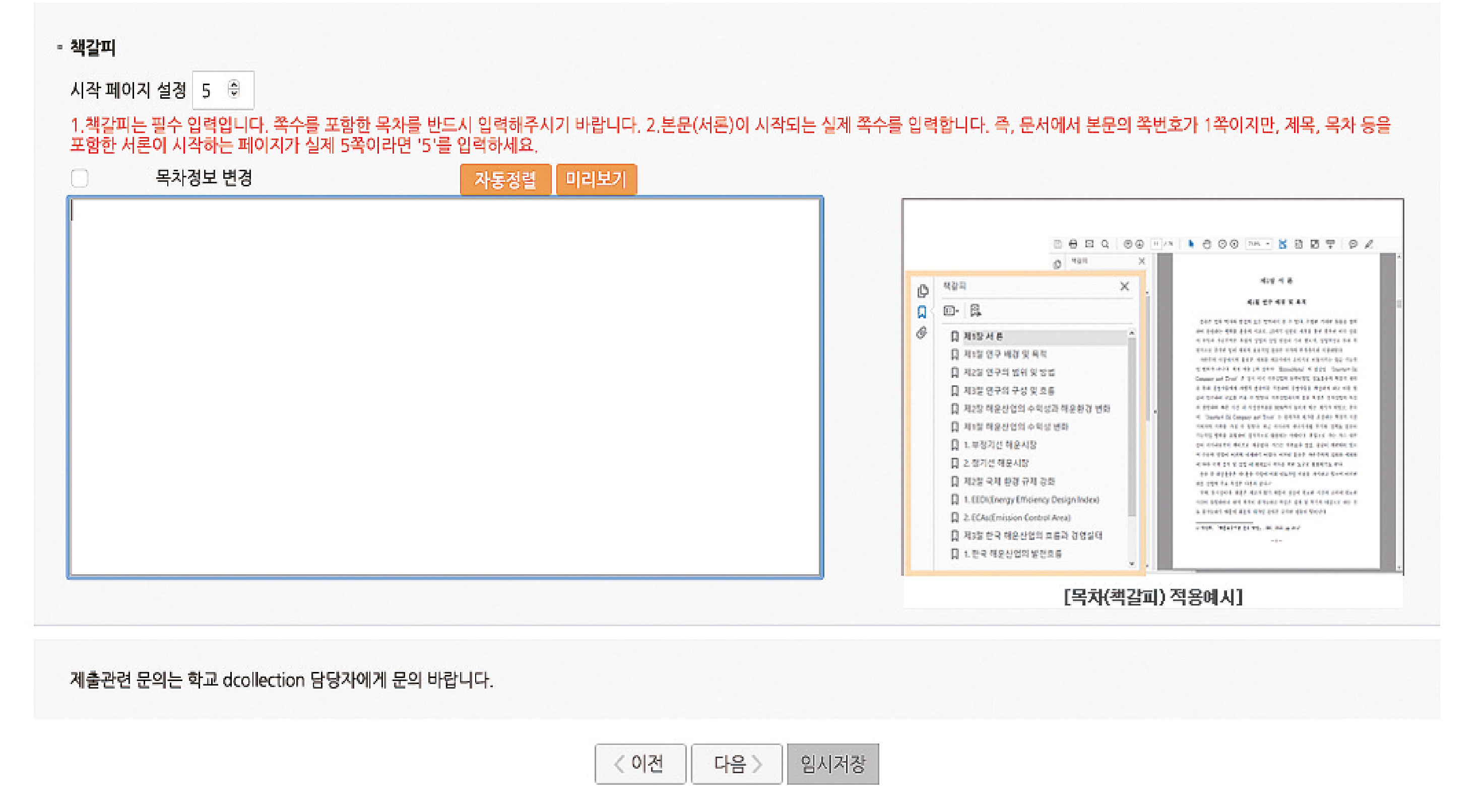 논문을 열람할 때 목차를 클릭하면 해당 페이지로 바로 넘어가도록 설정하는 것이 책갈피 기능이다. 따라서 물리적인 페이지를 바르게 입력하는 것이 중요하다.