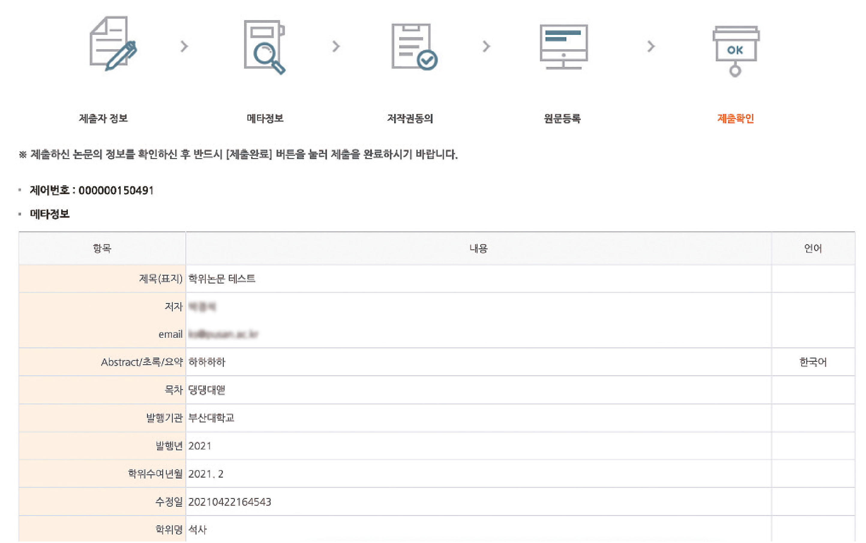 학위논문 온라인 제출은 다섯단계로 구분된다.