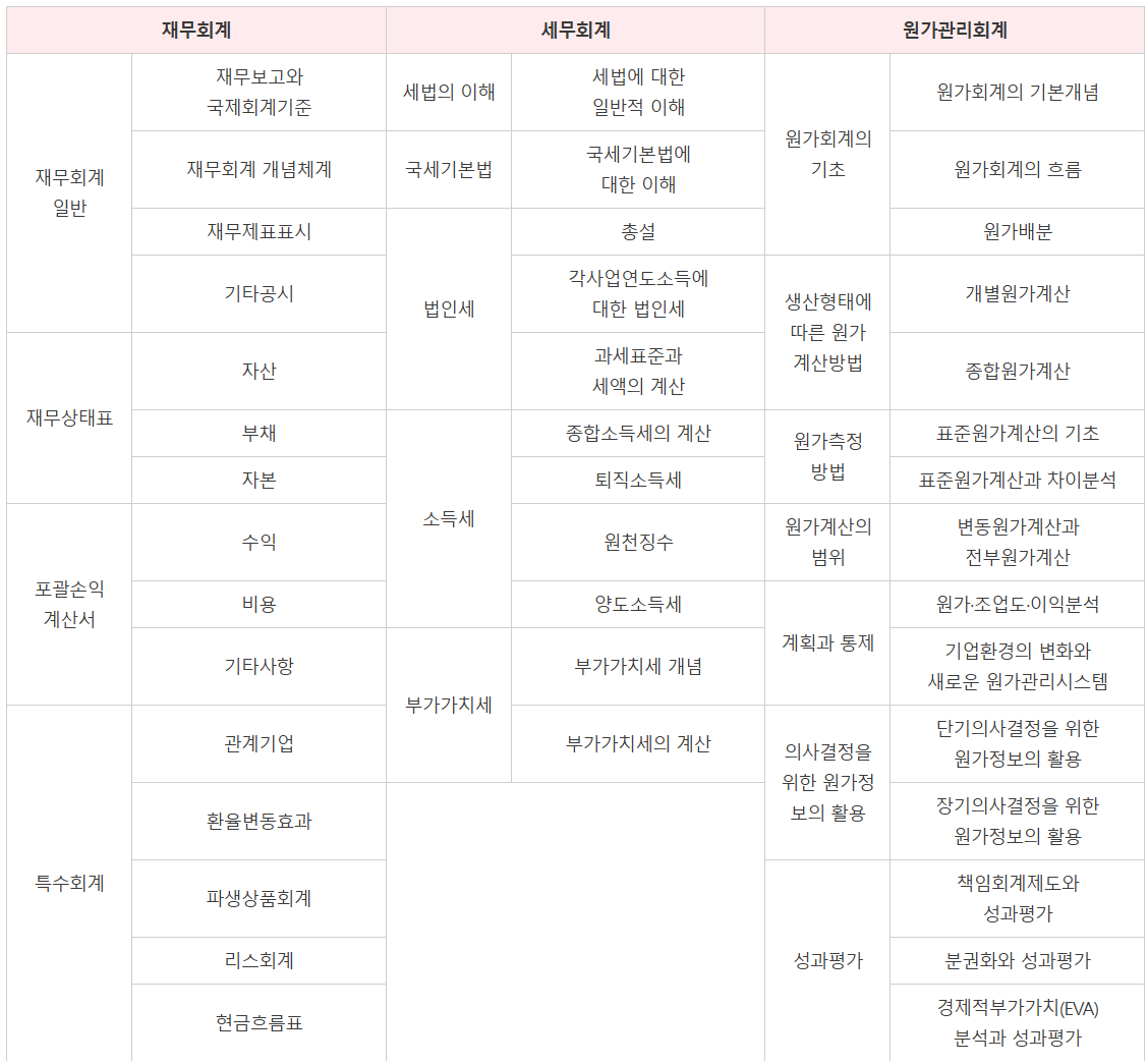 - 세부과목 : 재무회계, 세무회계, 원가관리회계 과목별 40문항 (객관식 4지선다형)
