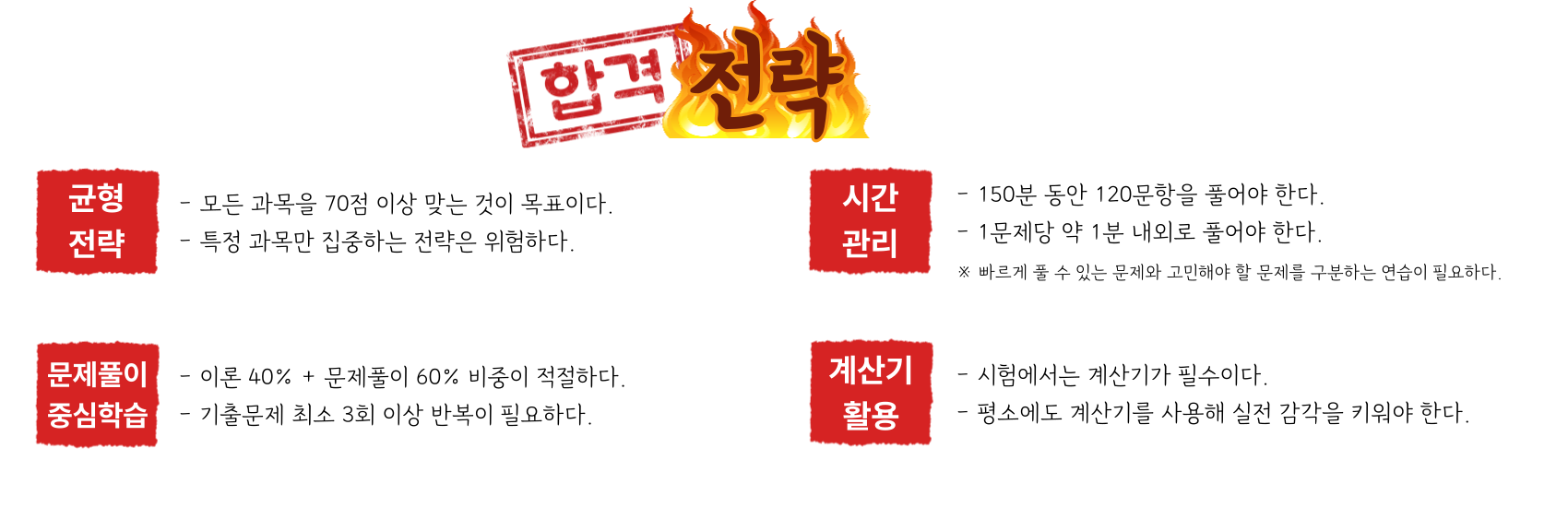 또한 문제는 전 범위에서 고르게 출제되기 때문에 일부 단원을 포기하는 전략은 매우 위험하다. 시험 난이도 자체는 깊기보다는 넓은 범위를 묻는 형태이므로, 넓고 얕게 전체를 커버하는 전략이 효과적이다.