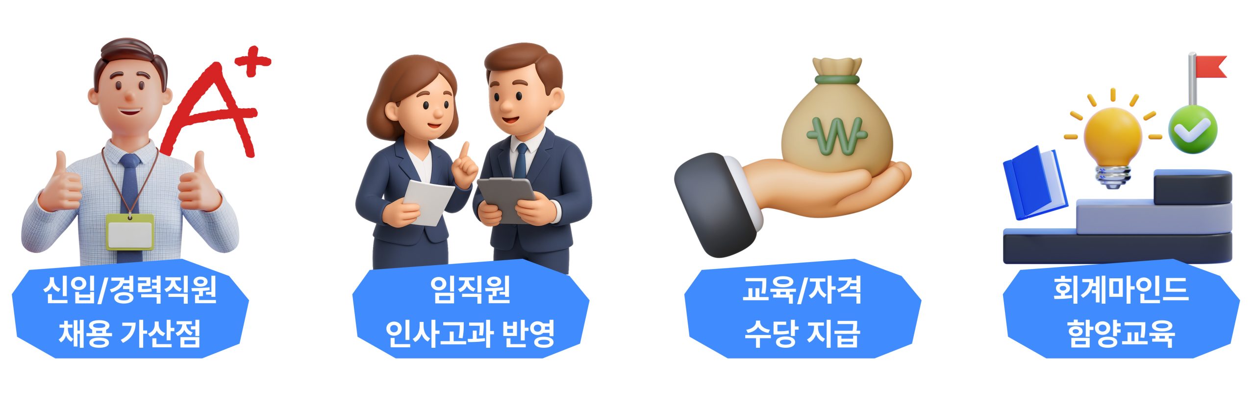 - 일반 기업 : 재경관리사 자격증 소지자에게 채용 시 가산점 부여, 임직원 인사고과 반영, 교육 수당 지급 등의 혜택을 제공