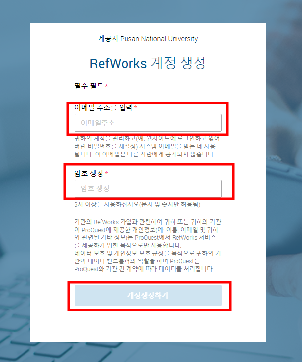 아래와 같이 회원가입 메뉴가 뜨면 가입하고자 하는 이메일 주소(RefWorks 로그인ID)와 비번을 입력하고 “계정생성하기” 버튼을 누릅니다.