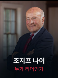 최근에는 21세기 글로벌 리더가 지녀야 할 덕목으로 ‘도덕’에 대한 중요성을 연구, 전파하고 있다. 2014년 폴린폴리시 선정 ‘ 세계에서 가장 영향력 있는 학자’로 뽑혔으며 현재 전략국제연구센터(CSIS)의이사를 맡고 있다. 저서로 《소프트 파워》 《리더십 에센셜》 《권력의 미래》 등이 있다. [출처: 한국강사신문 2021년 8월 기사]