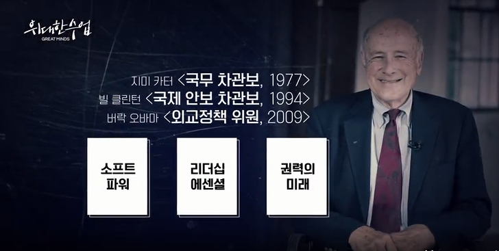 EBS 석학 강연 <위대한 수업-그레이트 마인즈>의 첫 문을 여는 조지프 나이는 글로벌 리더의 산실이라 불리는 하버드 케네디스쿨의 학장을 역임했고 카터, 클린턴, 오바마 행정부에서 국제 외교 업무를 담당하며 여러 대통령과 리더들을 지켜봐 온 리더 전문가다. 카터 행정부 때 정계에 입문하면서 ‘어떻게 나를 따르게 할 것인가’를 고민하다 권력이란 강요와 보상이 아니라 매력으로 상대를 움직여 원하는 것을 얻는 힘이라는 것을 깨닫고 ‘소프트 파워’ 개념을 도입, 스마트 파워(소프트파워+하드파워)이론으로까지 발전시켰다.